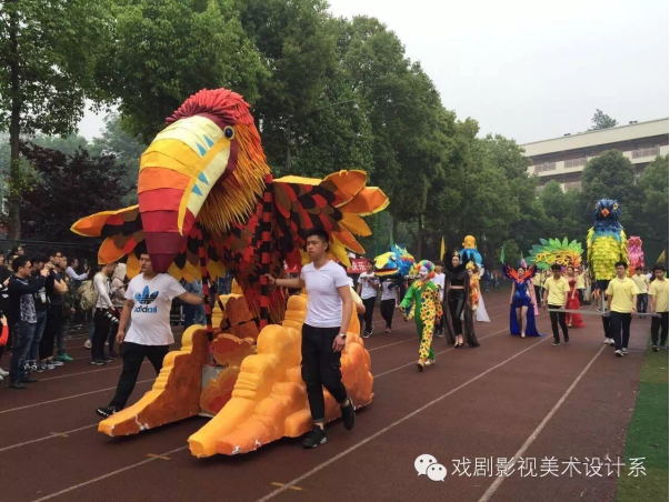 戏剧影视美术设计系师生方队,是由我系十名青年教师组成的教师方队,本次运动会的体操方队和入场方队的道具、服装、化妆等都是老师和学生亲自设计和制作完成。戏美系;大胆开拓,勇于创新,在教学、学生思想工作等方面均取得良好成绩。在展现戏美系德才兼备的良好风貌同时以最认真的态度,最投入的状态,竭尽全力取得更优异的成绩。在本次春季运会中,衷心希望我系运动健儿本着勤奋的精神,勇于拚搏,充分展现戏美系,追求美、创作美的专业特点和精神面貌。