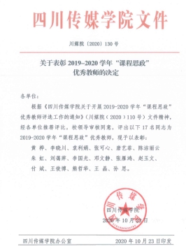 2020年10月23日,我系黄桦教授荣获四川传媒学院2019-2020学年“课程思政”优秀教师称号。