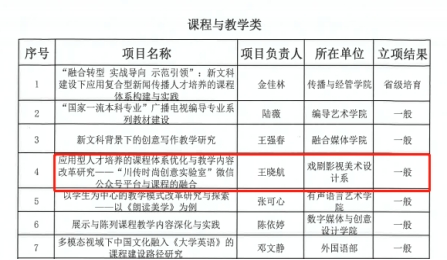 为进一步深化学校教育教学改革,加强内涵建设,提高人才培养质量,学校组织开展2021年度校级教育教学改革项目立项工作。根据《四川传媒学院关于2021年校级教育教学改革项目立项工作的通知》相关要求,我系积极组织开展校级教育教学改革项目立项工作,共申报校级教育教学改革项目17项,其中专业建设与改革类项目1项,课程与教学类项目6项,实践教学改革类项目5项,青年教师专项(网络课程类)项目5项,经过专家评审与学校审核,我系17项教育教学改革项目全部予以立项。