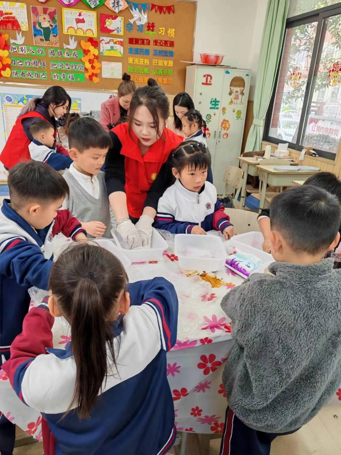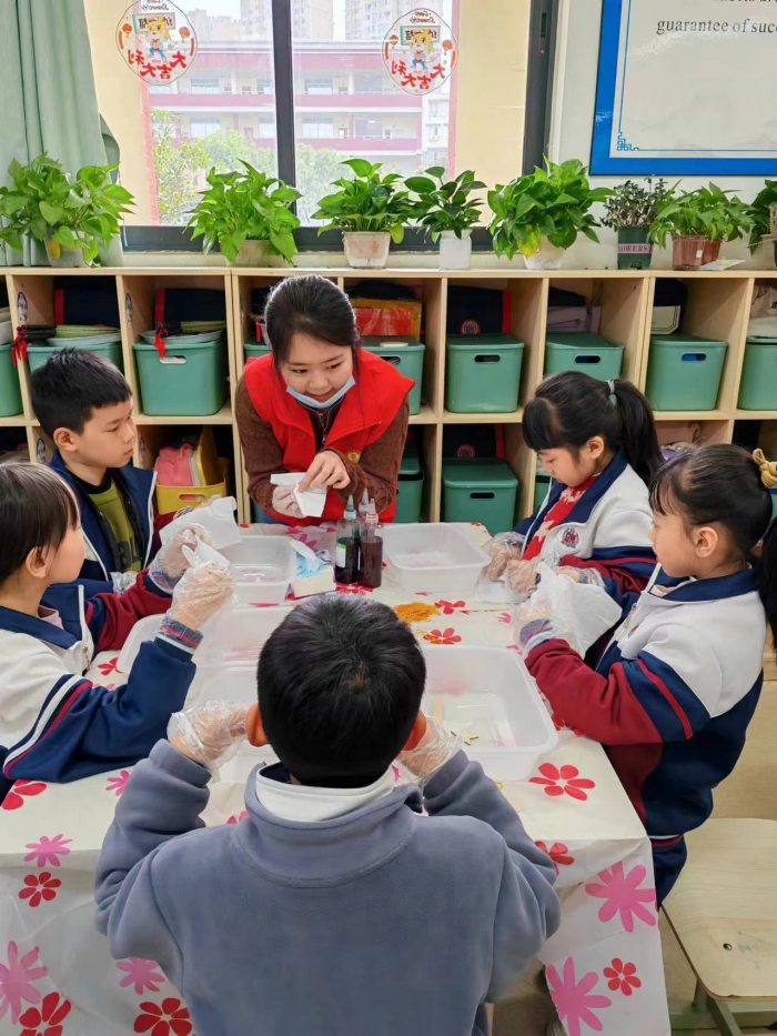 扎染是中国民间传统而独特的染色工艺,其作品所呈现的图案、花纹样式多变。小小一片布,染出新天地,普通的白布被一双双小手赋予了鲜活的生命。在扎染活动中,孩子们根据志愿者讲解扎染的“浸一扎一染一洗一拆一晒”步骤,体验着扎染艺术的魅力,享受着劳动的喜悦与自豪,发现美和创造美的能力也在不断提升。