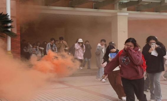 警报声响起,A2教学楼内正在上课的师生迅速进入应急状态,他们用毛巾捂住口鼻,快速且有序地从楼内撤离至安全区域,疏散过程有条不紊。微型消防站接到火警后,队员迅速响应,对起火点喷水操练。随后,郫都区消防救援大队专业救援力量进入模拟起火点,搜救受伤被困人员。各组人员与消防救援人员协同配合,近十分钟后,明火熄灭,受困人员获救,演练结束,教学工作恢复正常。