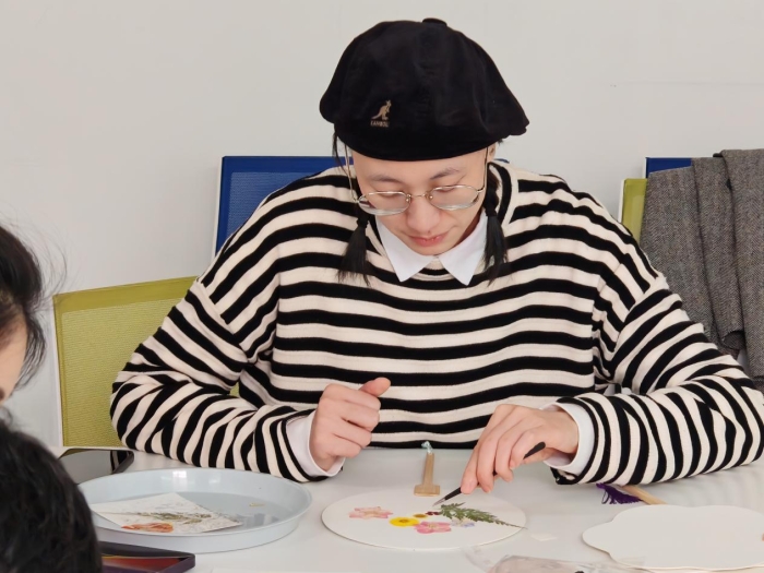 活动现场,学生志愿者讲解压花团扇的制造工艺与制作方法,各位教师们熟悉制作方法后开启创作,教师们以干花为媒,在素色团扇上精心构思、巧妙布局,最终创作出独一无二的团扇作品。活动最后,教师们手持亲手制作的团扇合影留念,轻盈的扇面与自信的笑容相映生辉,展现新时代女性教师的艺术修养与精神风貌。