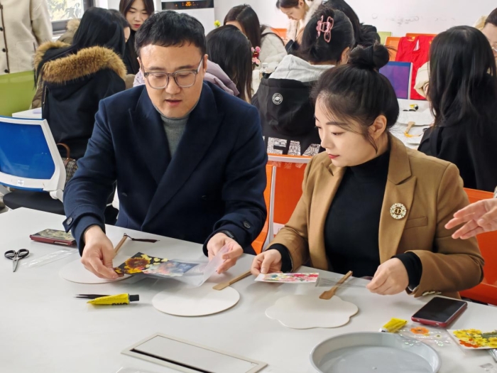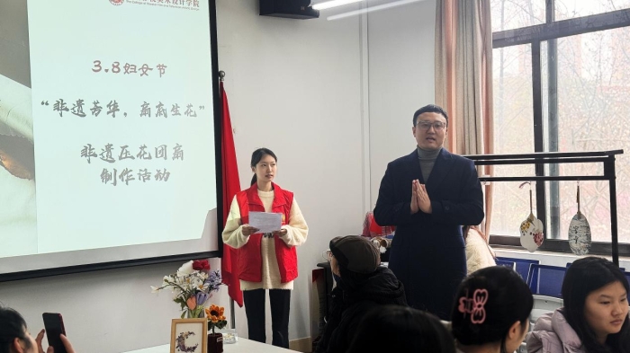 活动伊始,学院特别邀请校工会女工委主任张一舟老师与大家共同开启非遗压花团扇之旅。随后,学院王晓航院长代表学院向全体女教职工致以节日的问候与祝福。他表示:“女教职工是学院发展的中坚力量,在教书育人、艺术创作中展现了卓越的才华与担当。希望今天的活动能让大家在非遗传统手作的魅力中放松身心,以更饱满的热情投身于教学与创作,绽放新时代女性的智慧与风采。”