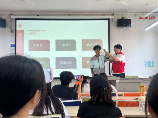 本次培训,由红十字会专业师资李瑾楠老师主讲,为参训学生详细讲解红十字运动知识、应急救护理念,并用通俗易懂的语言、生动具体的案例向学员们讲解了救护概论、心肺复苏、AED使用、气道异物梗阻、创伤救护等核心理论内容。培训师引导学员们进行现场互动学习,并通过实际案例,向学员们强调正确进行现场急救的重要性。接着培训师直观演示了海姆立克手法、心肺复苏、止血、包扎和固定标准操作,通过分步骤操作示范、手把手指导,帮助学员们将理论知识转化为实际操作技能,帮助大家在遇到突发急救事件时能够准确迅速采取有效急救措施,提高风险防范意识。
