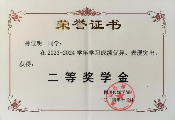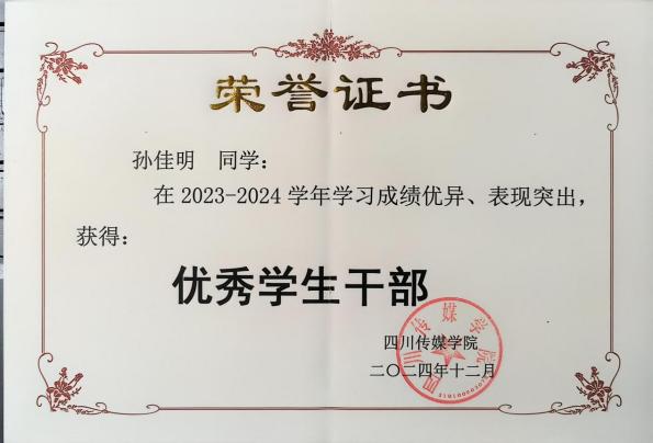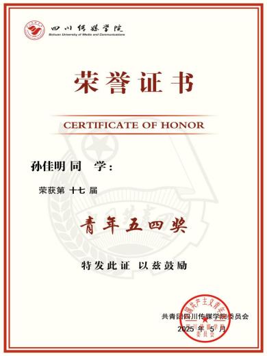做有实青年,以拓能力之界。“书山有路勤为径,学海无涯苦作舟”。在学业上,孙佳明同学虚心好学,勤奋刻苦。经过三年的不懈努力,综合测评成绩连续两年位列全院前10%,其中2024-2025学年综合成绩在专业年级排名中位列第一。凭借良好的学科能力和综合素质,获得四川省2026届优秀毕业生、四川传媒学院2026届优秀毕业生的荣誉称号。同时,积极参与我院《奢侈品策展》微专业的学习,并以高分结业。