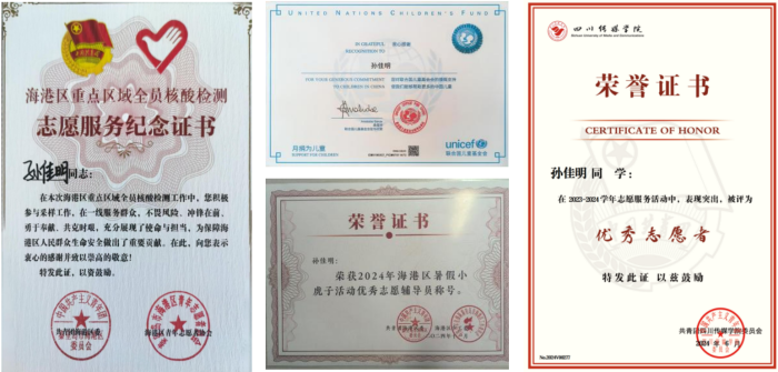 做有为青年,以务社会之需。“志愿始于心,奉献在于行”,投身于社会服务是培养责任感的重要途径。在社会实践中,孙佳明同学坚持以全心全意服务师生为宗旨,参与微公益创投项目,非遗文化进社区进校园活动,带领学院获得优秀学生会组织、优秀志愿者团队等荣誉。全平台累计志愿时长近400小时,累计志愿服务60余次,成为志愿四川星级志愿者。收到联合国儿童发展基金会的表扬信,并被授予“秦皇岛市海港区抗击新冠疫情先进个人”等荣誉称号。