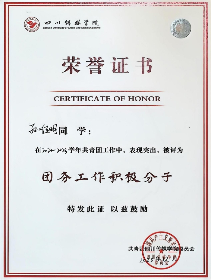 做有志青年,以促时代之新。恒者行远,思者常新。作为一名坚定的共产主义信仰者,孙佳明同学始终坚决维护党的领导,深入学习路线方针政策。自进入大学校园以来,就以严格的标准来要求自己,参加党课培训,不断学习党的理论知识。积极参加共青团四川传媒学院第五次团员代表大会,有坚定理想信念,有坚定的政治方向,参加校团委(青春川传)团课录制并主持戏剧影视美术设计学院国旗下演讲。用实际行动回答“生在红旗下,长在春风里”的时代邀约。在校期间,他踊跃投身于党团活动的组织工作中,获得四川传媒学院优秀共青团员、团务工作积极分子、优秀共青团学生干部、优秀学生会主席等多项荣誉称号,并获得共青团四川传媒学院第十七届“青年五四奖”等荣誉称号。